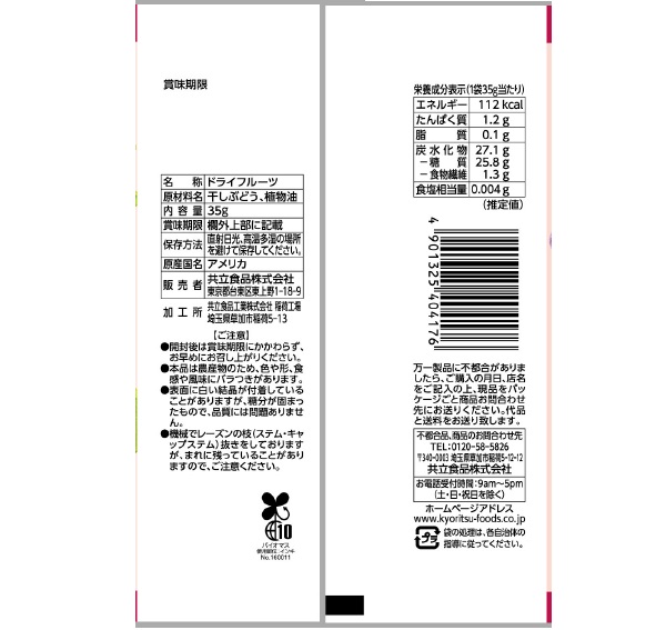 1袋35g当たり:エネルギー112kcal、たんぱく質1.2g、脂質0.1g、炭水化物27.1g、糖質25.8g、食物繊維1.3g、食塩相当量0.004g |