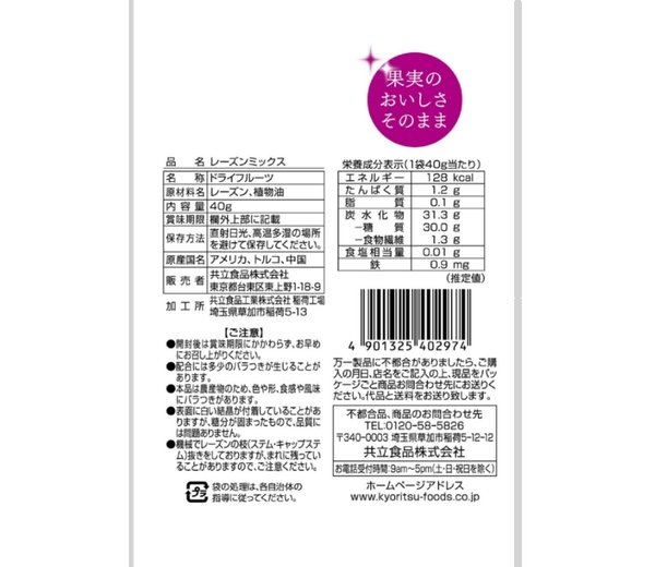 1袋(40g当たり):エネルギー128Kcal、たんぱく質1.2g、脂質0.1g、炭水化物31.3g(糖質30.0g、食物繊維1.3g)、塩分相当量0.01g、鉄0.9mg (推定値) |