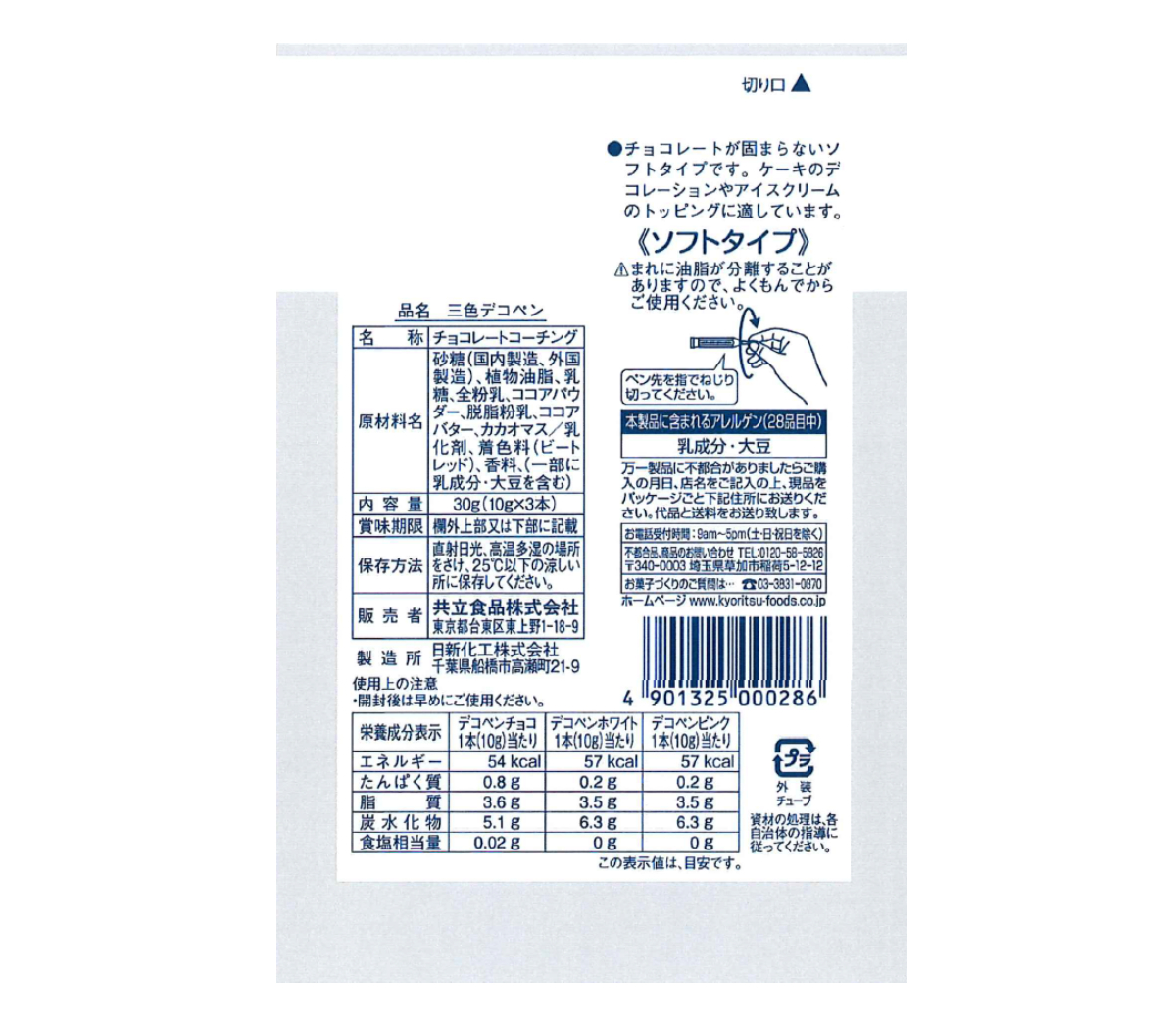 ペン先を手でカットして、お菓子にお好みの絵やイラストが描けるペン型タイプのチョコレートです。チョコレートが固まらないソフトタイプです。ケーキやアイスクリームなどのデコレーションにも最適です。 |