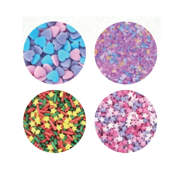 キラキラシュガーにハート・星・スプレーシュガーが入ったバラエティー豊かなトッピングセットです。カラフルなトッピングでお菓子を華やかに仕上げます。 |