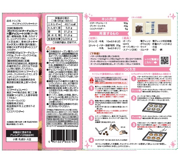 <ビターチョコレート(準)チョコレート>砂糖(タイ製造)、植物油脂、乳糖、カカオマス、ココアパウダー/レシチン(大豆由来)、香料 <クッキーミックス>小麦粉(国内製造)、砂糖 <ココアパウダー>ココアパウダー |