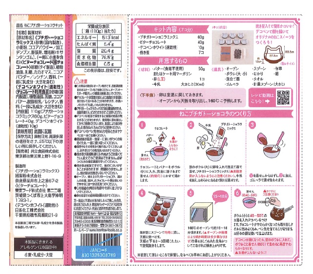 〈プチガトーショコラミックス〉砂糖(国内製造)、小麦粉、ココアパウダー/加工デンプン、膨張剤、増粘剤(キサンタンガム)、(一部に小麦粉を含む) 〈ビターチョコレート(準チョコレート)〉砂糖(タイ製造)、植物油脂、乳糖、カカオマス、ココアパウダー/レシチン、香料、(一部に乳成分・大豆を含む) 〈デコペンホワイト(速乾性)(チョコレート利用食品)〉砂糖(国内製造)、植物油脂、乳糖、ココアバター、脱脂粉乳/レシチン、香料、(一部に乳成分・大豆を含む) |