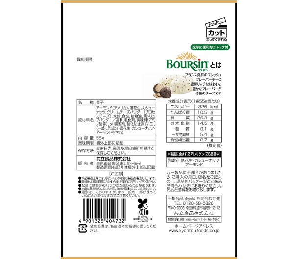 アーモンド(アメリカ)、落花生、カシューナッツ、クリームチーズパウダー(プロセスチーズ)、水飴、食塩、植物油、黒トリュフパウダー/香料、乳化剤、調味料(アミノ酸)、pH調整剤、酸化防止剤(V.E)、(一部に乳成分・落花生・カシューナッツ・アーモンドを含む)