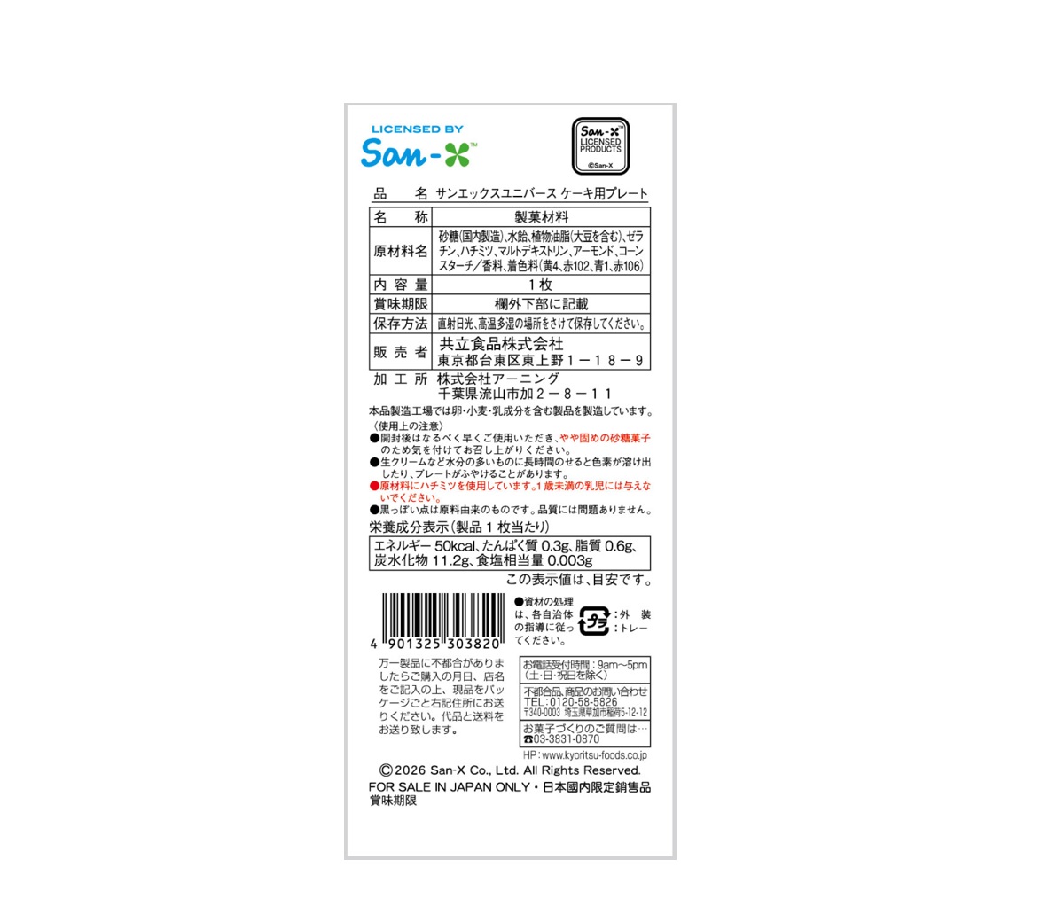 すみっコぐらし、リラックマ、たれぱんだ等のキャラクターが集合した賑やかなプレートです。親子のケーキ作りを楽しく盛り上げます。甘い香りのいちご風味です。 |