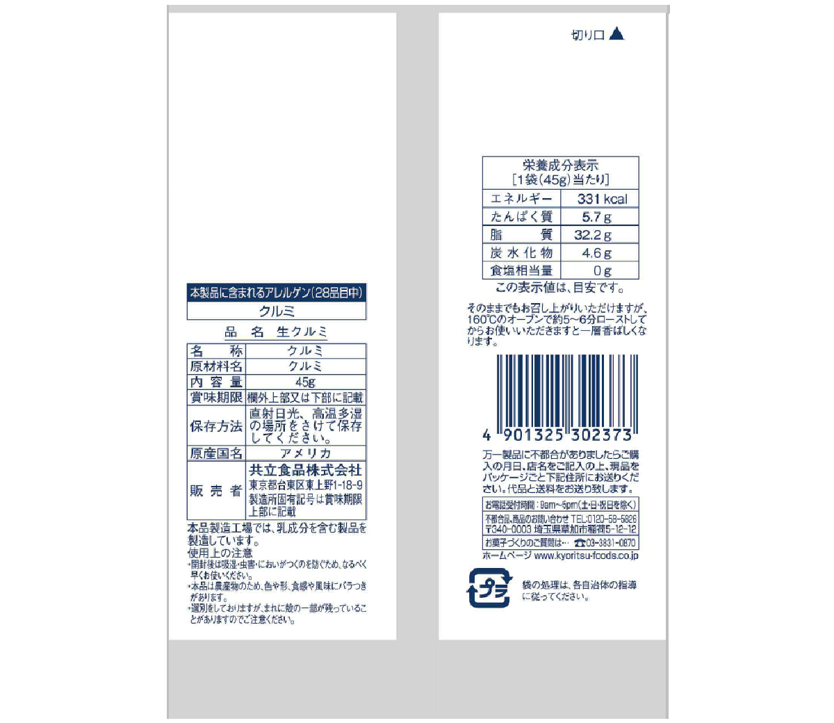 1袋(45g当たり):エネルギー331kcal、たんぱく質5.7g、脂質32.2g、炭水化物4.6g、食塩相当量0g |