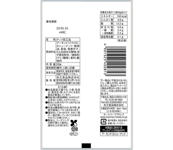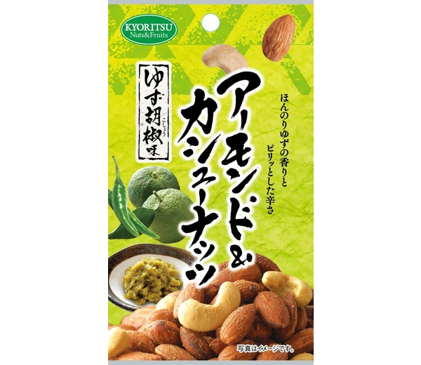 アーモンド(アメリカ)、カシューナッツ、植物油、食塩、青唐辛子、たん白加水分解物、ゆず果皮粉末/調味料(アミノ酸等)、香料、酸味料 |
