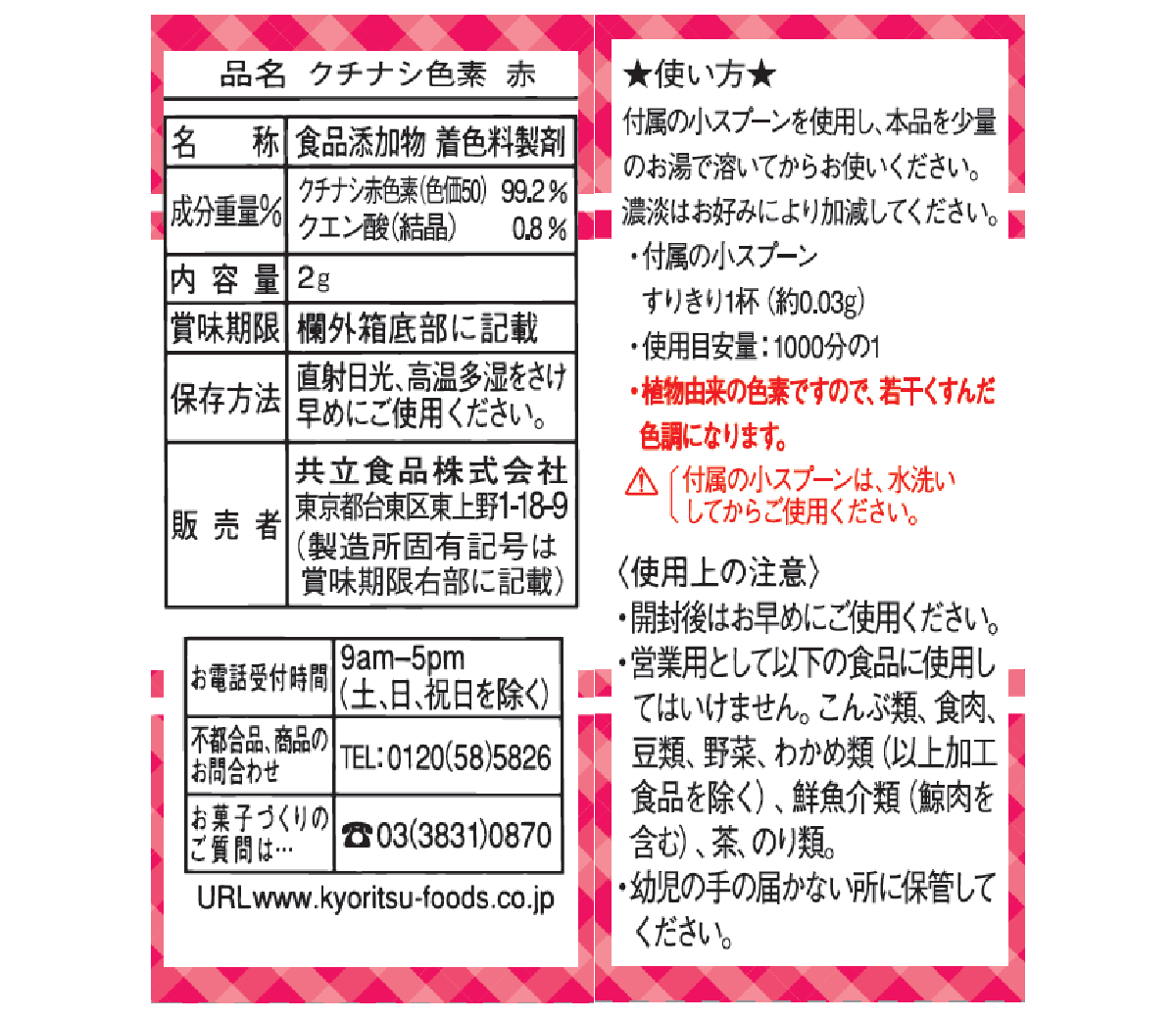 天然のクチナシ果実から抽出した赤色色素です。 ※商品付属の小スプーンは、 すりきり1杯は約0.03gです。 |