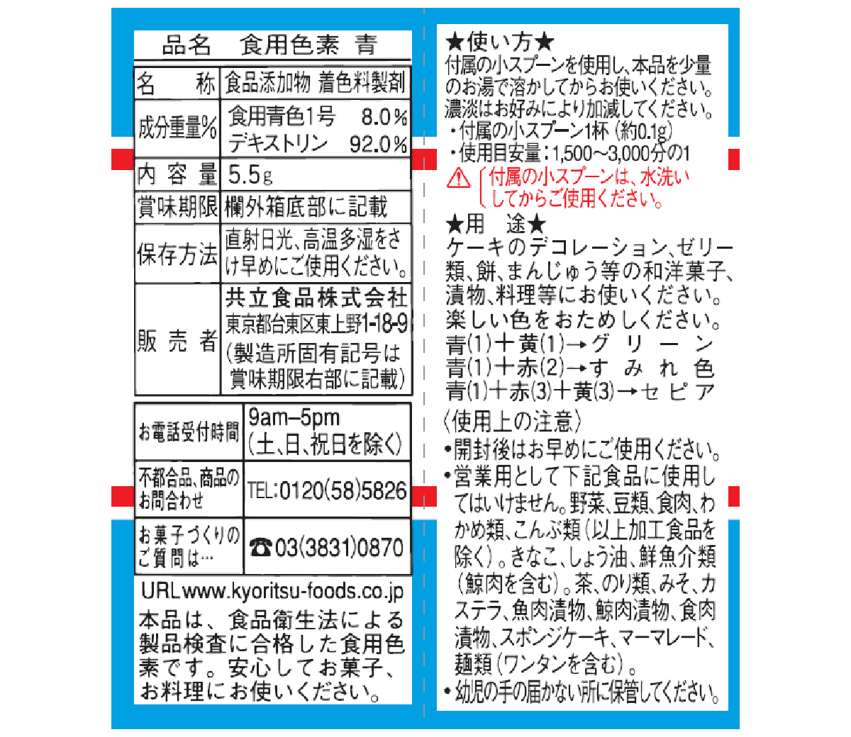少量で色鮮やかに仕上がる色素です。ケーキのデコレーション、ゼリー類、餅・まんじゅう等の和洋菓子、漬物・料理などに使用できます。 ※本品は食品衛生法による製品検査に合格した食用色素です。安心してお菓子、お料理にお使いください。 |