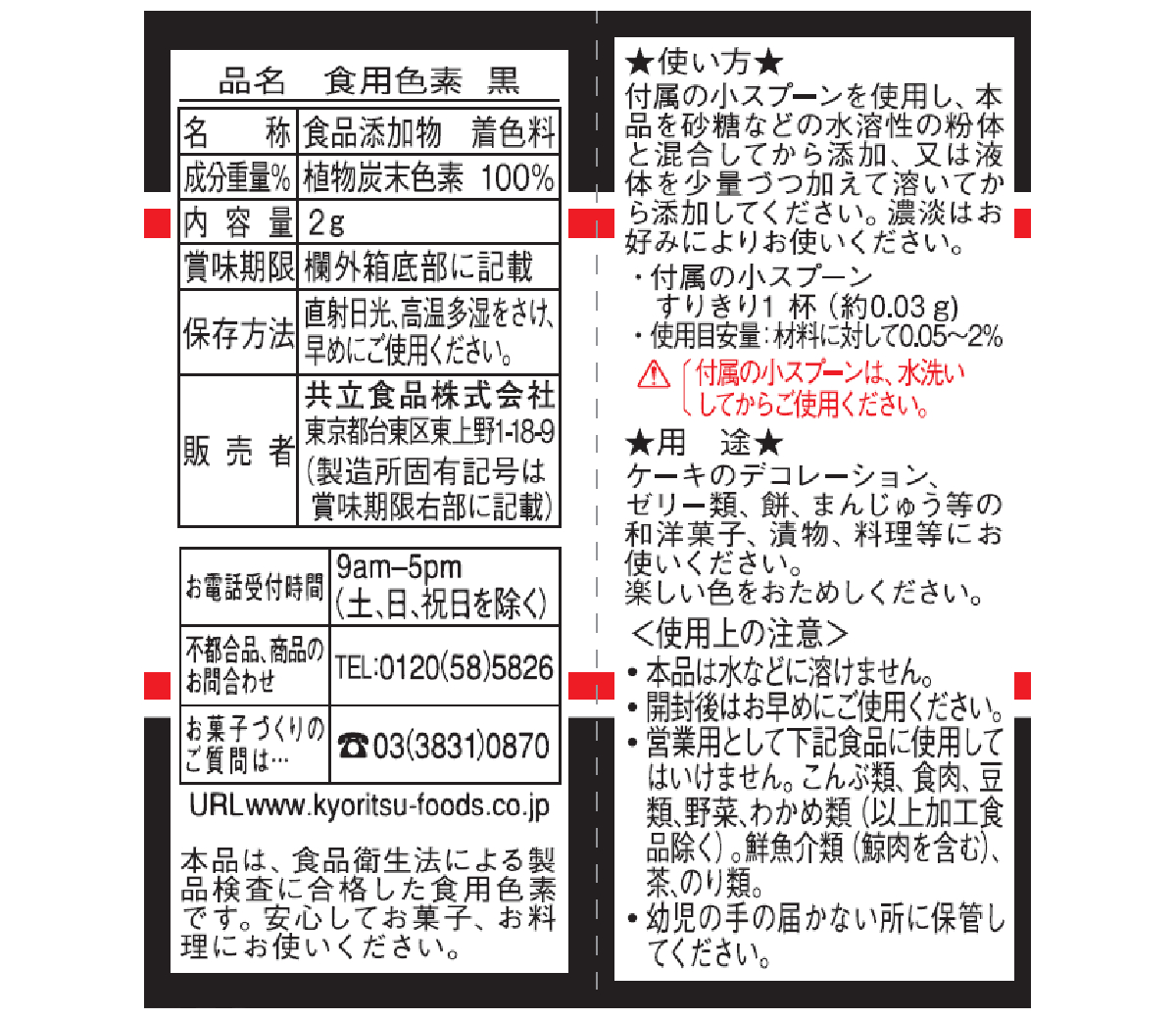 ・付属の小スプーンを使用し、本品を砂糖などの水溶性の粉体と混合してから添加、又は液体を少量づつ加えて溶いてから添加してください。濃淡はお好みによりお使いください。