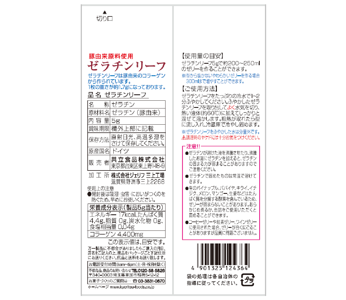 製品5g当たり:エネルギー17kcal、たんぱく質4.4g、脂質0g、炭水化物0g、食塩相当量0.04g、(コラーゲン4400mg) |