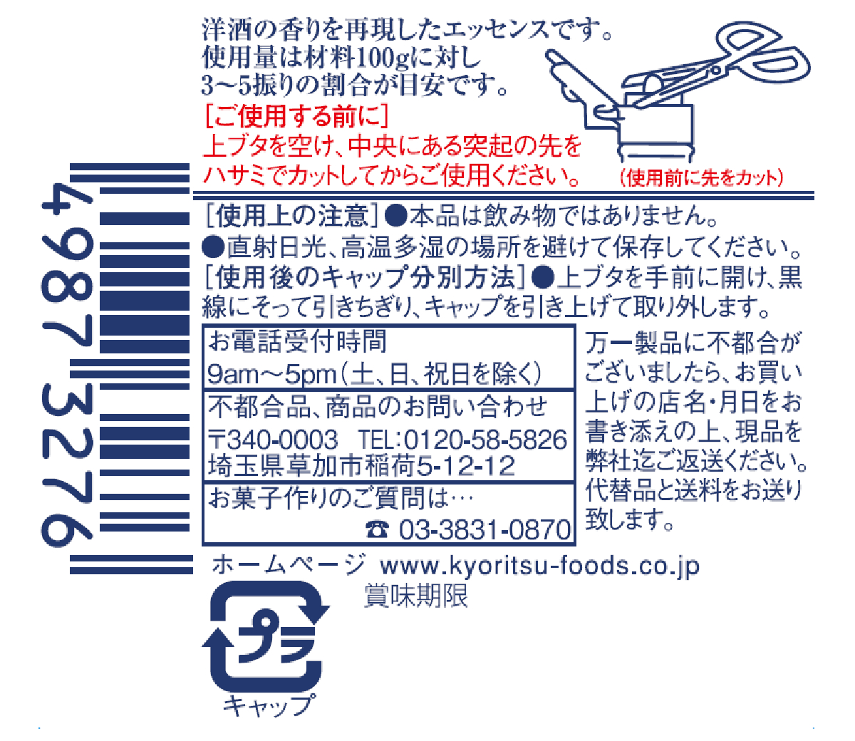 洋酒の香りを再現したドライフルーツやチョコレートと相性の良い、ブランデーのエッセンスです。 |
