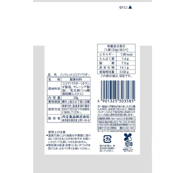 ココアパウダー(オランダ製造、マレーシア製造)/乳化剤(ショ糖脂肪酸エステル) |