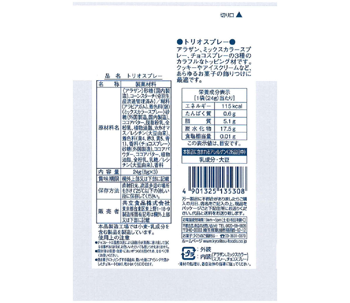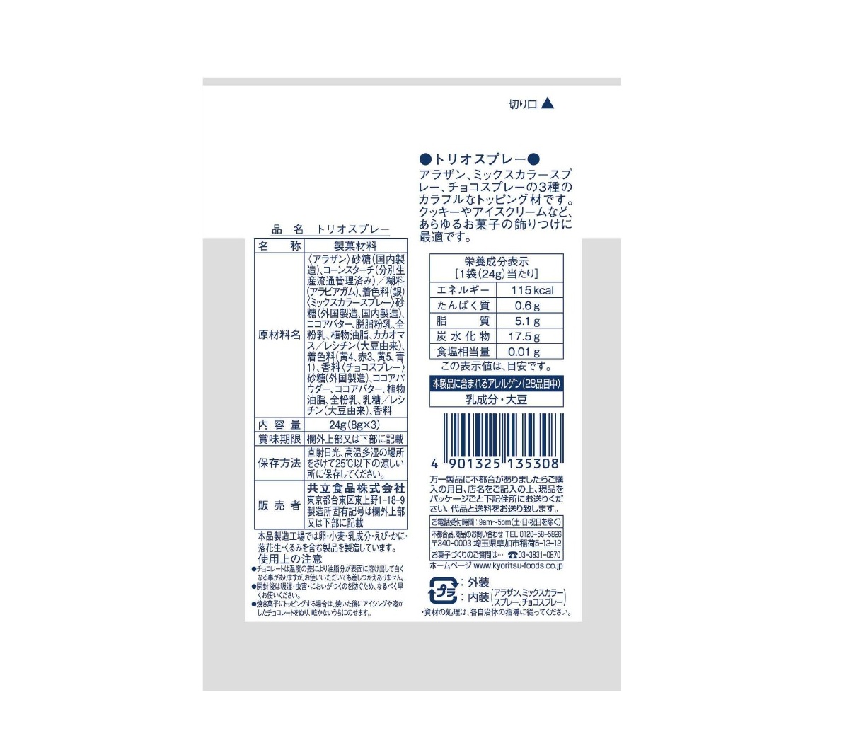 アラザン、ミックスカラースプレー、チョコスプレーの3種のカラフルなデコレーション材です。クッキーやアイスクリームなど、あらゆるお菓子の飾りつけにお楽しみ頂けます。 |