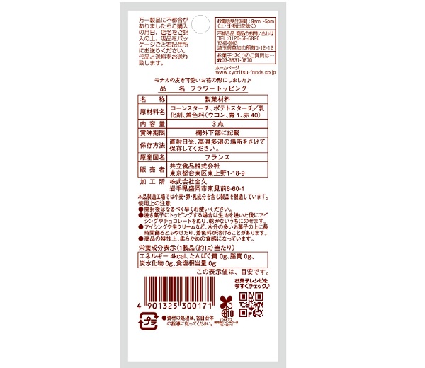コーンスターチ、ポテトスターチ/乳化剤、着色料(ウコン、青1、赤40) |