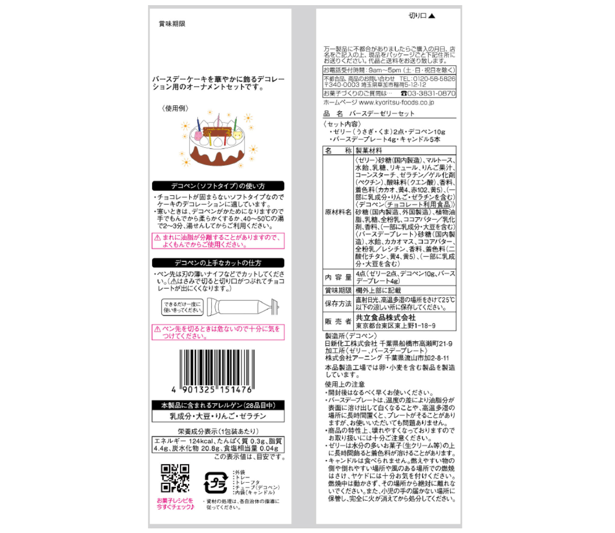 バースデーケーキを華やかに飾るデコレーション用のオーナメントセットです。ゼリー(うさぎ・くま)、デコペンホワイト、バースデープレート、キャンドル5本付。デコペンチョコはチョコレートが固まらないソフトタイプです。