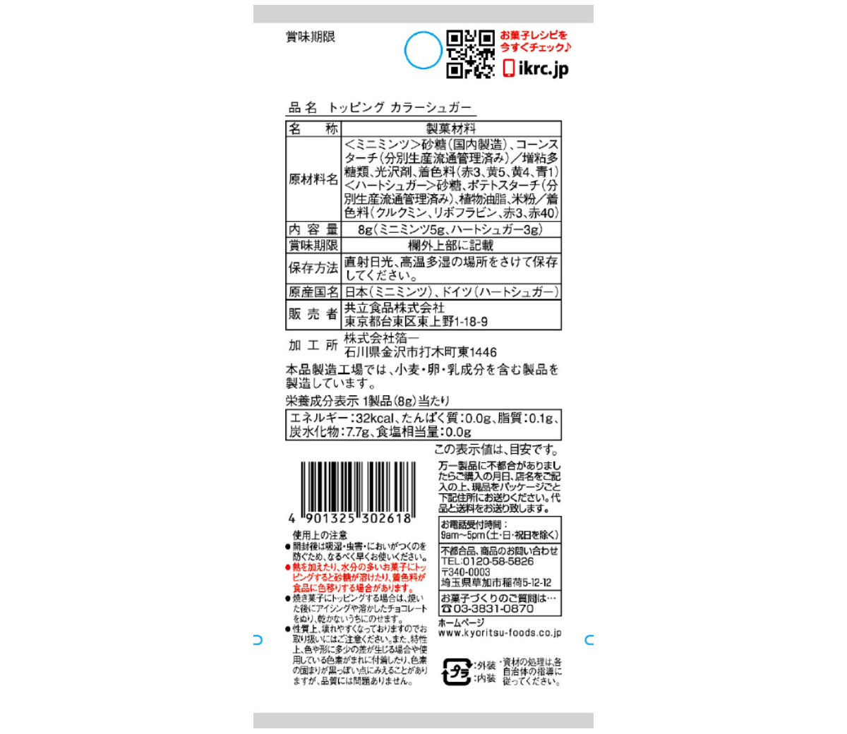 1製品(8g)当たり:エネルギー32kcal、たんぱく質0.0g、脂質0.1g、炭水化物7.7g、食塩相当量0g |