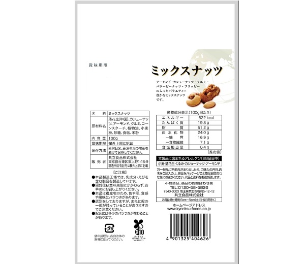 落花生(中国)、カシューナッツ、アーモンド、クルミ、コーンスターチ、植物油、小麦粉、砂糖、食塩、米粉 |