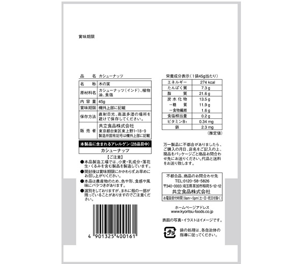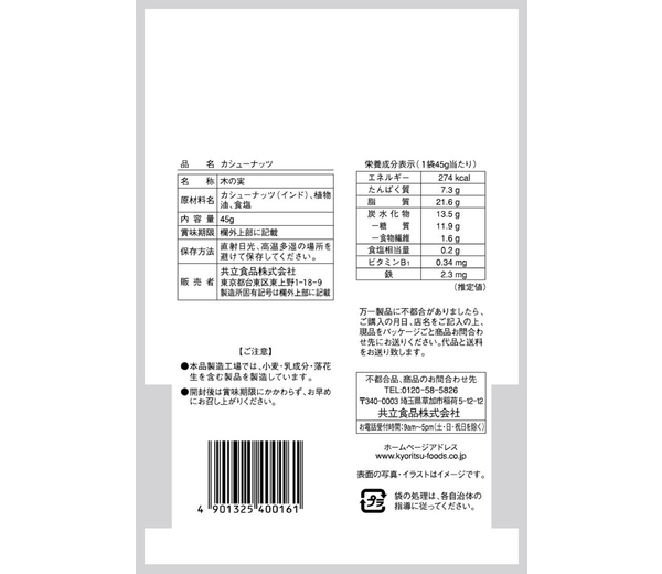 1袋45g当り:エネルギー274kcal、たんぱく質7.3g、脂質21.6g、炭水化物13.5mg(糖質11.9g、食物繊維1.6g)、食塩相当量0.2g、ビタミンB1 0.34mg、鉄 2.3mg (推定値) |