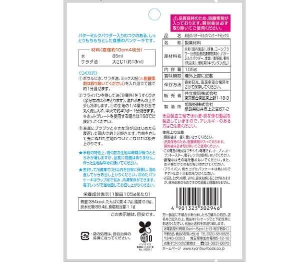 直径約10cm4枚分 <その他必要な材料> 水・・・85ml サラダ油・・・大さじ1(約13ml) 材料をよく混ぜ、フライパンで焼いてお楽しみください。 |