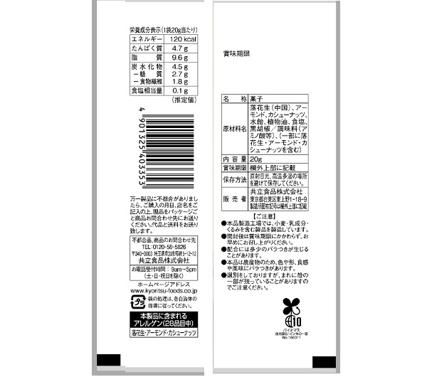 【本製品に含まれるアレルゲン(28品目中)】 落花生・アーモンド・カシューナッツ ●本品製造工場では、小麦・乳成分・くるみを含む製品を製造しています。
