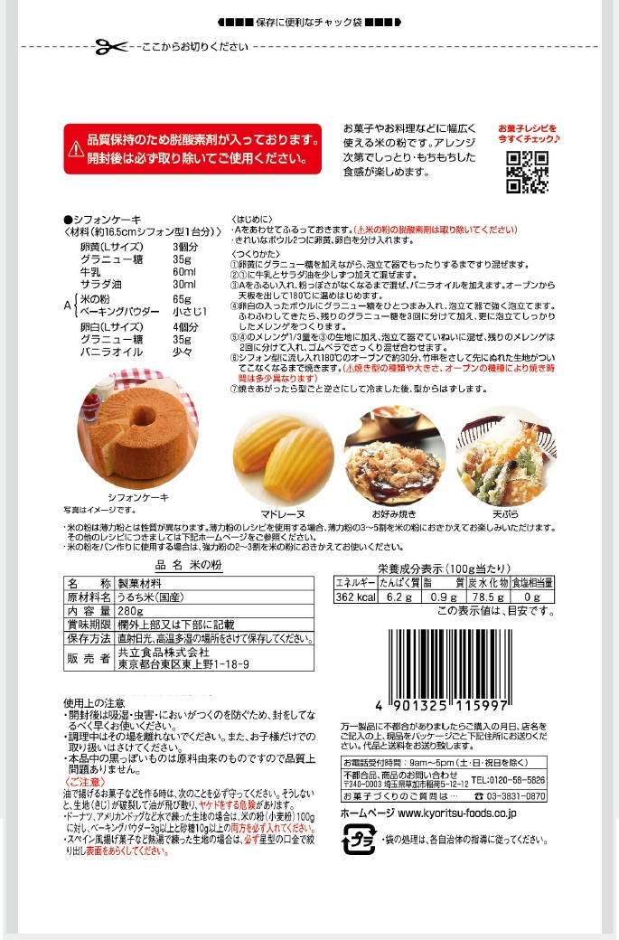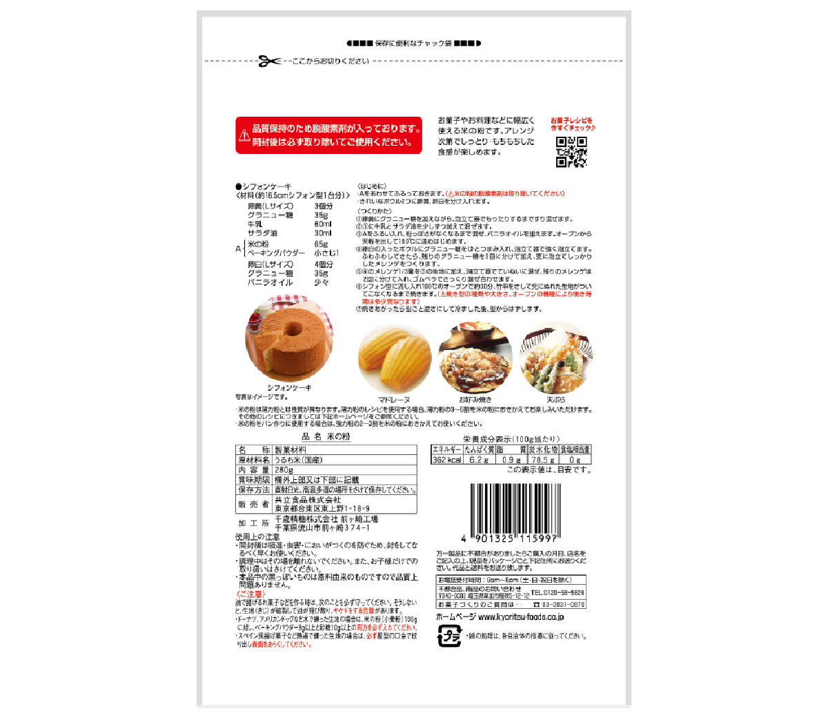 ・油で揚げるお菓子などを作る際は、次のことを必ず守ってください。そうしないと生地が破裂して油が飛び散り、ヤケドをする危険があります。 ・開封後は吸湿・虫害・においがつくのを防ぐため、封をしてなるべく早くお使いください。 |
