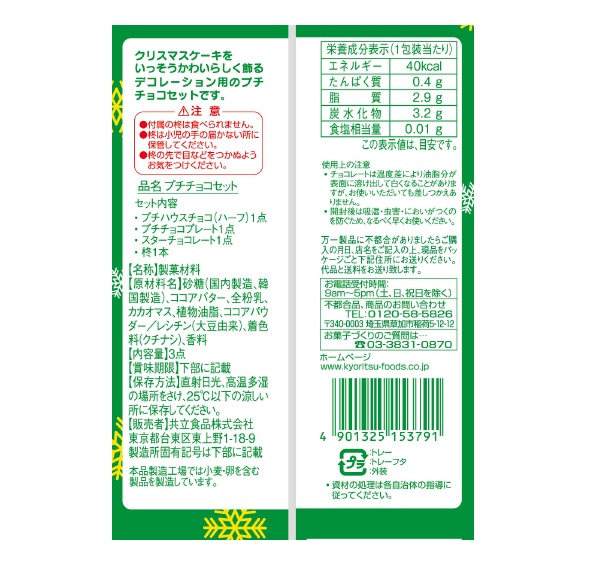 クリスマスケーキをいっそうかわいらしく飾るデコレーション用のプチチョコセットです 【セット内容】 ・プチハウスチョコ(ハーフ)1点 ・プチチョコプレート1点 ・スターチョコレート1点 ・柊1本 |