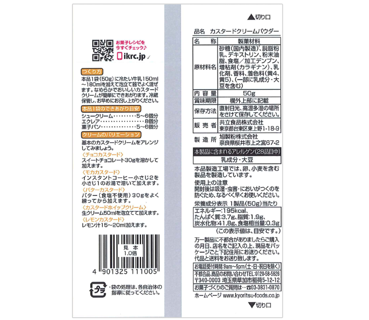 1袋(50g)に冷たい牛乳150ml~180mlを加えて泡立て器でよく混ぜます。なめらかでおいしいカスタードクリームが簡単に仕上がります。
