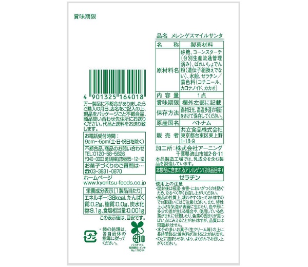 砂糖、コーンスターチ(分別生産流通管理済み)、ばれいしょでん粉(遺伝子組換えでない)、水飴、ゼラチン/着色料(コチニール、カロテノイド、カカオ) |