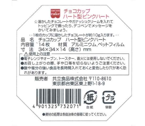 【ラッピング材】ハート型がキュートなアルミカップです。溶かしたチョコレートやガナッシュクリームを入れてトッピングで飾ったり、デコペンでメッセージを描いたりしてお楽しみください。 [1枚のカップに溶かしたチョコレートが約10g入ります] |