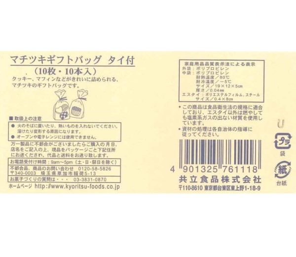 材質 袋:ポリプロピレン タイ:ポリエステルフィルム、スチール |
