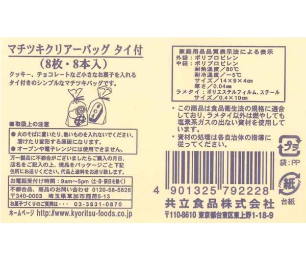 材質 袋:ポリプロピレン タイ:ポリエステルフィルム、スチール |