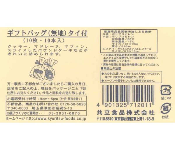 材質 袋:ポリプロピレン タイ:ポリエステルフィルム、スチール |