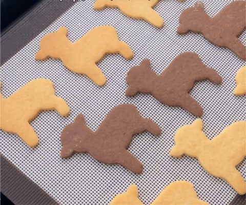 ココアクッキー生地で作る場合も、同じように絞り出し、お好みで飾り用の小さな菓子(トッピングハートシュガーなど)を首につけて並べ、100℃に温めたオーブンで約80分乾燥焼きします。