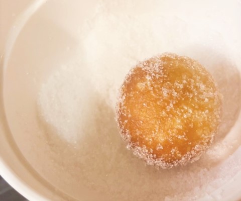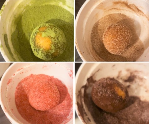 油を切り、熱いうちにトッピング(グラニュー糖、抹茶パウダー、ココアパウダー、いちごパウダー、シナモンシュガー)をまぶします。