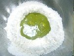 ①のくぼみに抹茶液を流し入れ、スプーンでまわりの粉を崩しながらとろりと生地がつやつやした状態になるまで混ぜ合わせます。