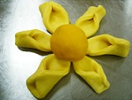 4を一つずつめん棒で丸く伸ばし、中心を少し残して深めに切り込みを6ヶ所入れ、外側をしっかりとつまみます。中心に3の餡をのせ、中心の上でしっかりと閉じます。