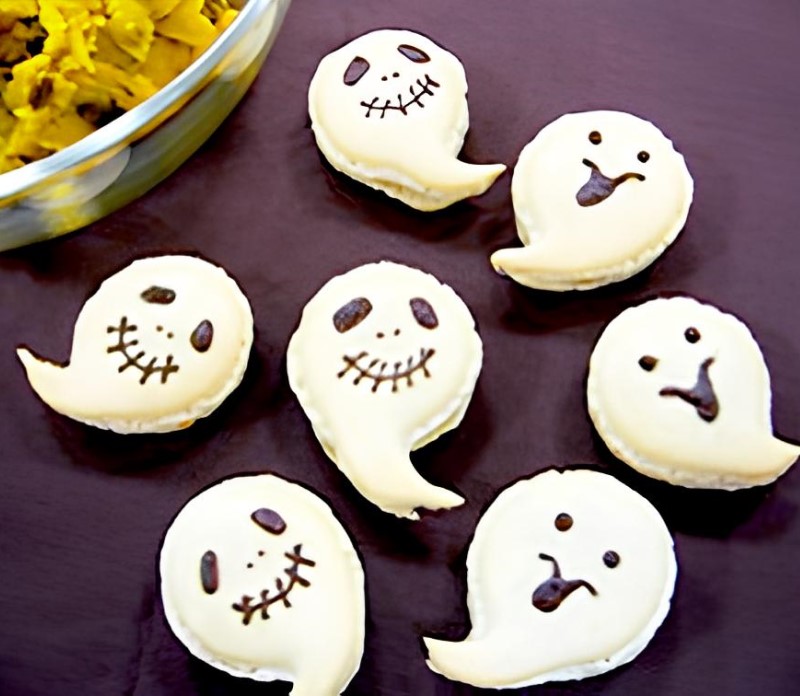 マカロンに、完全に冷めたかぼちゃクリームを乗せてサンドし、デコペンでおばけの顔を描きます。