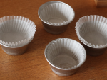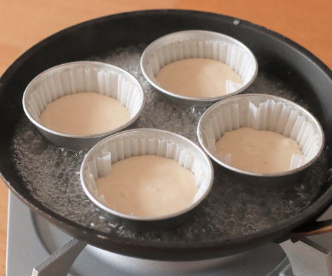 用意しておいたプリン型に流し入れ、フライパンに入れて蓋をして中火で10分蒸します。