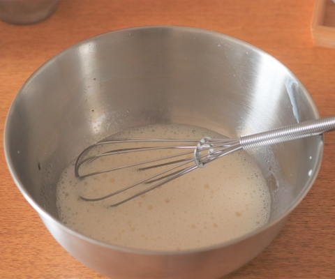 ボウルに無調整豆乳、米油を入れて泡だて器で混ぜます。