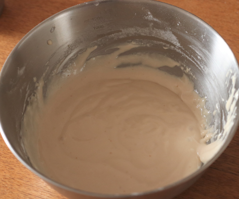 米粉、砂糖を加えて混ぜ、なめらかになったらベーキングパウダーを加えて混ぜます。