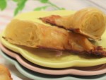 卵液に漬けたライスペーパーをクルクルと巻いて焼くだけで作れる!表面はパリッと香ばしく中はもっちりとした新感覚のクロワッサン。パン生地で作るクロワッサンとは違ったおいしさを楽しめます。表面にハロウィンカラーのトッピングをのせて仕上げます。