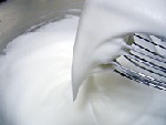 完全に水気のない綺麗なボウルに卵白を入れて、泡立て器で泡立てます。 ふわふわとしてきたらグラニュー糖50gを2~3回に分けて加え、更に泡立ててしっかりとしたメレンゲ(泡立て器ですくい上げるとピンと角が立つまで)を作ります。