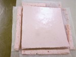 固まったらオーブン用シートごと取り出し、四隅をナイフでカットします。※ナイフを水につけながらカットすると切りやすくなります。