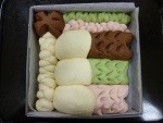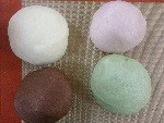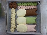 (お手持ちのホームベーカリーの取り扱い説明書に従ってください。)生地を取り出して4等分にし、ペースト状にした【B】、ぬるま湯で溶いた赤と緑の色素【C】【D】をそれぞれ少しずつこねながら加え混ぜ混み、4色作ります。