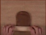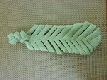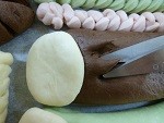 大きめの茶色、緑、ピンク生地をめん棒で長方形に伸ばし、折って生地をしっかりと閉じます。片側にカードで切り込みを入れて、尾ひれの形を整えます。