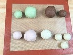 (生地が固い場合はぬるま湯約10ml(分量外)を少しずつ加えて調整します。)生地をきれいに丸めてそれぞれボウルに入れ、ラップ材をかけて35℃位の温かい場所に30~40分おいて倍の大きさになるまで発酵させます。