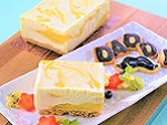 マンゴーのオレンジ色とレアチーズの白。二色のマーブル模様が爽やかなフルーツたっぷりのチーズケーキです。