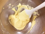 ②にほぐした卵を数回に分けて加え、そのつど空気を含ませないようにすり混ぜます。