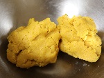 ①に卵黄を入れて混ぜ、混ぜ合わせておいた【A】と牛乳を加えて切るように混ぜます。全体がそぼろ状になれば、手で生地を軽くこねてまとめます。
