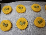 ③を5㎜厚さにカットし、手で形を整えて、オーブン用シートを敷いた天板に間隔をあけて並べます。お好みの個数にかぼちゃの種をのせて軽く押さえます。